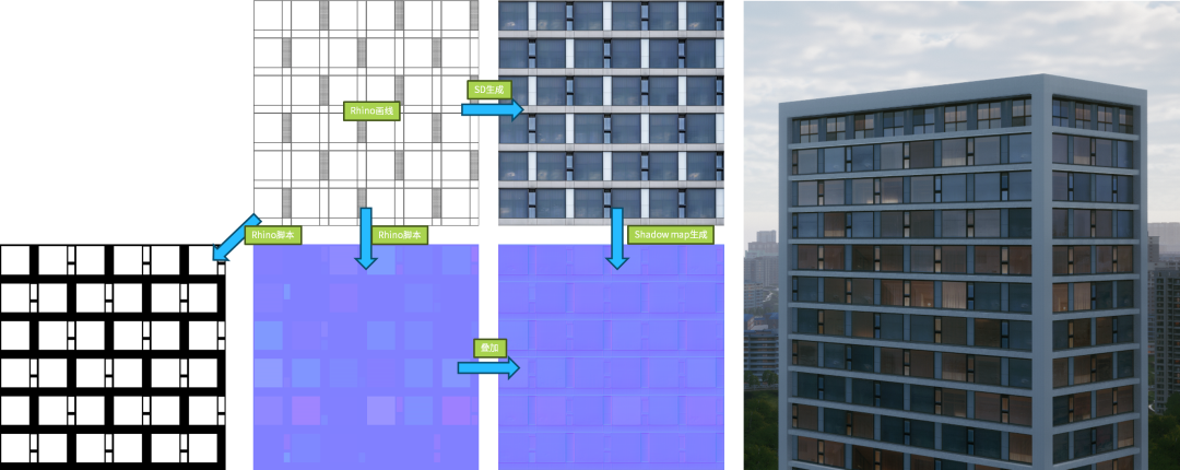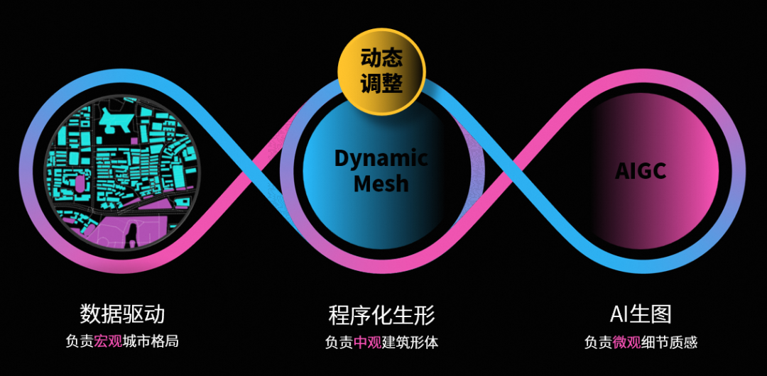 购买商城纹理素材存在不完善或不匹配的问题,我们还是希望自力更生。所以我们又自然而然的看向了当前最大的技术趋势之一AIGC,我们相信AI图像生成可以为我们提供了另辟蹊径的可能性。至此,我们的解决方案框架的主体就形成了。数据驱动,负责宏观的城市格局;程序化生形,负责中观的建筑形体;AI生图,负责微观的细节质感。当然我们也了解,没有绝对完美的逻辑模型,我们必须要提供人工介入调整的空间,而恰好DynamicMesh的动态调整能力完美的满足了这一点。