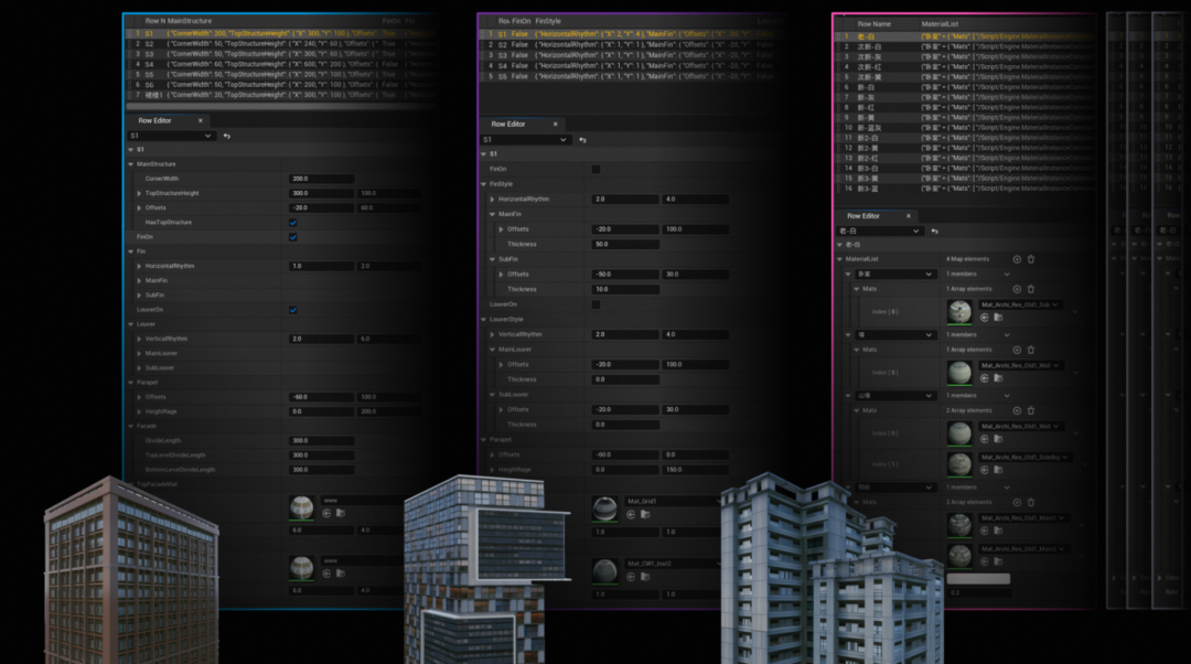 另外还有一些常见的屋顶装饰结构和坡屋顶,包括常见的两面坡、四面坡。所有相同类型的建筑也会有完全不同的主色调、主材料和细节,于是我们为不同的逻辑模型建立对应的数据结构来管理和拓展风格。最后在数据的判定与驱动下,支持整个城市在视觉上达到以下两个特性:终于,我们的数据驱动和建筑逻辑模型工作可以合流了,我们来看看把这些建筑生成出来是什么样子。粗看觉得还行,但细看还是有很多可以找茬的地方。