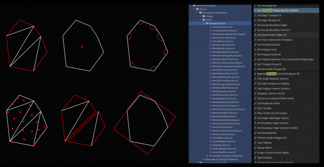 在c++当中,提供了一些标准的计算几何能力,简单的诸如计算轮廓内角、求取轮廓重心、多种逻辑等分线条等等,复杂的诸如Mesh表面撒点、经典计算几何算法(Voronoi等)集成等以及对Dynamic Mesh进行底层信息获取和通用操作的能力,诸如查询Mesh的拓扑信息、获取Mesh裸边等等。