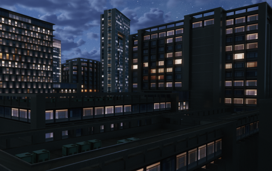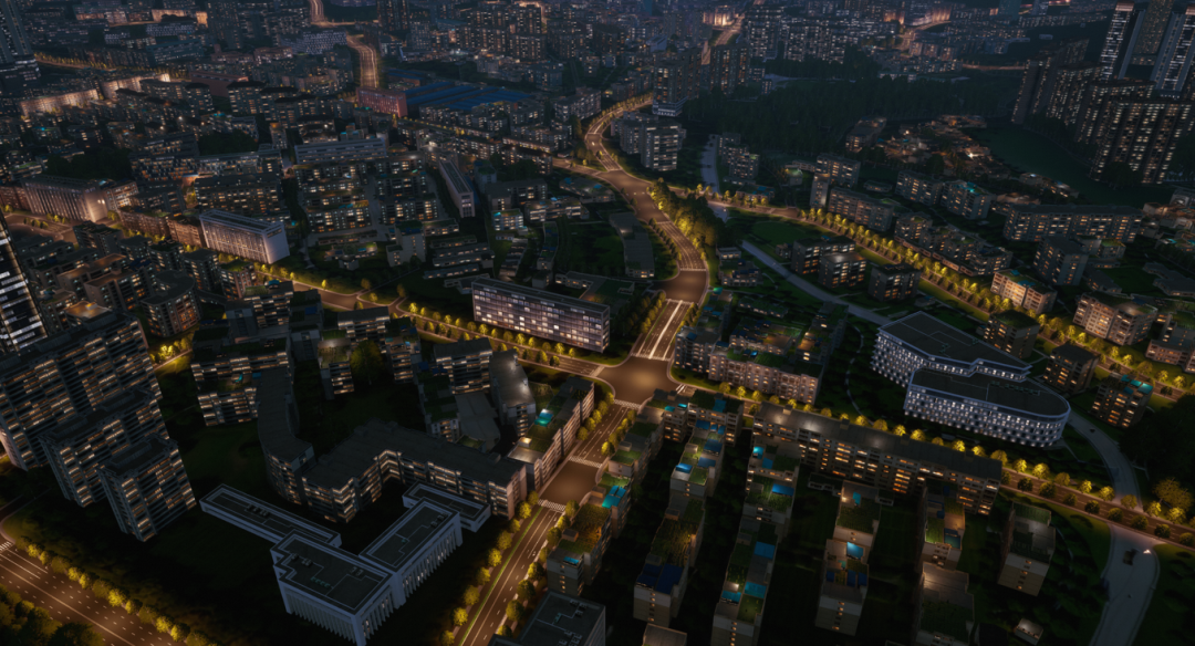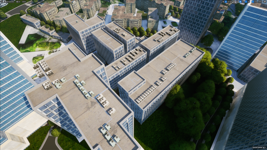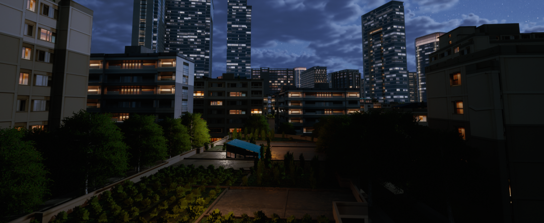 当然,我们的地理信息数据可以直接作为控制性信息,通过ai生成地面环境贴图,它在鸟瞰视角是足够丰富真实的。所以这个时候AI又当起了规划师或者景观设计师。并且它提供的结果不只是一种真实感,而是可能还具有一定的逻辑,比如在这里,根据建筑的布局,AI做了一次不错的步行道路规划,主要的步行动线、进入建筑的支路、以及与城市支路的连接处都设置得非常合理。AI甚至某种意义上还能作为“打光师”存在,像这样复杂的、有氛围的夜景灯光质感可以直接通过日景贴图输入AI进行生成,它们可以作为一种光照贴图非常有效的支撑夜景的打造。结合UE的材质与蓝图系统的能力,我们可以良好的解决建筑对气候天光变化的响应,也能解决开关灯比例、亮度、色温和随机性等等细节问题。另外,AI生成的夜景图片也天然的可以良好解决室内灯光的多样性问题,例如酒店中各个房间的不同灯光表现(大灯、夜灯、阅读灯)体现出来的整体亮度、色温、窗帘开关情况在AI这里都可以产生丰富的状态区分。最终我们甚至没有在场景中单独一盏传统意义上的灯光,仅靠建筑材质自发光与道路铺设低开销的粒子光就可以打造出逼真的城市夜景质感,在渲染上是非常轻量级的表现。关于轻资产与轻量级:整个探索过程我们没有美术人员,也几乎没有预制模型,刚刚看到的36km2的城市,最终建筑模型100M,无优化策略下达到2K40+帧。从研发和应用两个角度,都是轻资产轻量级的解决方案。也是良好的数字孪生城市基座。关于AIGC:在AI生成三维模型还没有大规模应用的当下,我们可能需要更多思考如何去筑巢引凤,让日趋成熟的AI生图能够在3D技术应用中有一定程度的落地,抓住一部分的技术红利。关于程序化生形:程序化生形并不新鲜,但集成在主流游戏引擎中并逐步形成生态,这将会是一个宏大的图景,如何各类专业领域的三维工具能力进入到游戏引擎当中,其生产过程与生产内容也充分享受到视效、交互、叙事等利好的加持,那么利好之处就可能非常多了,本文能展示的仅仅是冰山一角了。八、DataV x Epic Fab:面向生态伙伴的“智慧城市”开发方案