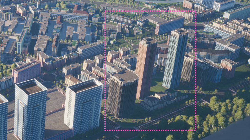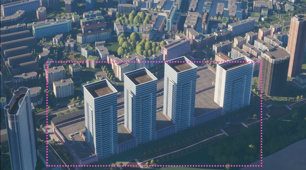 其次,红框里的商业综合体,本该是裙楼与塔楼的形体关系,结果因为地理信息数据的存储结构原因,成了另一种奇怪的咬合关系。这个问题之前在数据处理的时候已经提到,属于裙楼判定问题。我们依然是利用属性集来进行判断,找出明显具有裙楼塔楼形体特征的轮廓组来执行特殊的分层逻辑,使用预先计算好的整体轮廓来构成裙楼。而不满足条件的则按原逻辑执行。建筑风格风格统一