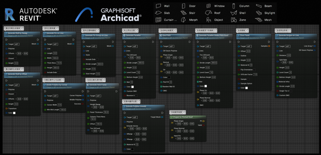 在一、二层基础上,我们构建了第三层:建筑设计层,可以一定程度上类比BIM软件,它的主要是以DynamicMesh Actor为载体,提供参数化生成带有建筑属性的构件的能力。
