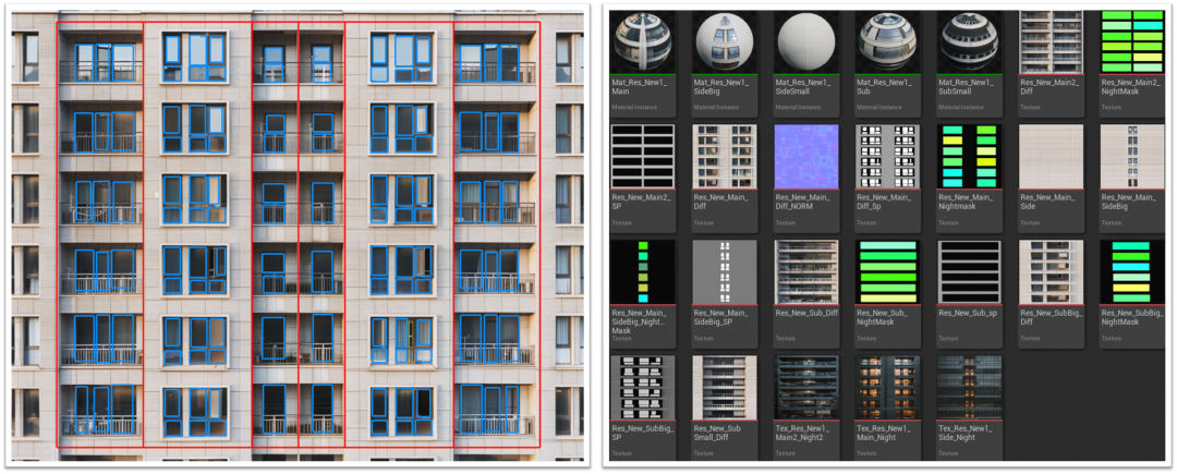 最后,也是最明显的问题,同一个住宅小区的色彩和风格不统一。针对这个问题我们在数据处理阶段早有准备,我们建立地块风格表以及建筑轮廓组风格表来综合处理风格统一问题,每个新遍历到的建筑数据都会先去查找这两个表,找到就读取,没有找到就自己创建。不同的建筑逻辑模型,有不同的风格判定逻辑,但判断的依据都是我们的建筑属性集,至于判断的方法就是多种多样的了,并且可以不断迭代不断细化的,所以这里也就不进行展开了。做好了这些工作,我们再来生成一遍城市,问题大部分得到了解决。逻辑问题大部分解决后,下面一个环节我们介绍一下AIGC方面的应用。AI在我们的实践中扮演了各种各样的角色。基于Stable Diffusion的Control Net,我们最容易想到的是输入一些简单线稿,由AI产出真实图像。同时我们可以通过脚本来定义线稿的图形语义,包括不限于法线、接受颜色的区域、反光度等等,高效生产Tiling类的材质。同样的方法也可以用来生成更复杂的住宅立面贴图,只需要画一个大致的住宅线稿给AI,这个时候AI可以充当建筑设计助理了,它会遵循我们期望的矢量结构,补全了大部分的细节。AI还可以从建筑助理升级到建筑师,我们可以不用动脑筋去构造一个线稿,直接文生图,让它去创作,它会返回更加逼真丰富的结果。只需CV识别或简单打标,一样可以进行前面提到的材质生产。