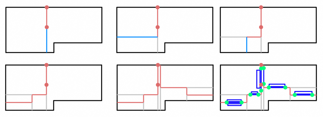 公共建筑屋顶更多的是管线与设备,它们恰好也主要是正交形态分布的,所以我们用了同样的基础工具,但不做划分,而是模拟一些左右转向的路径,来形成管线走向和设备布局。