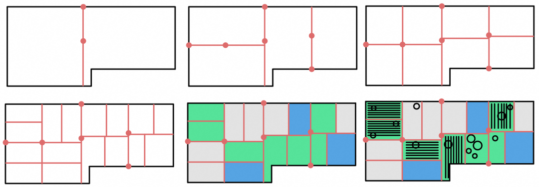第二种逻辑是以空间功能布局为导向,这种逻辑主要用于住宅,它的立面会非常直观的对应户型的布局,只要我们掌握了不同房间的空间规律,就可以构建合理的住宅外立面。比如住宅建筑中,不同大小的户型对应着不同的建筑面宽,也具有典型的房间排布规律,比如“客厅-次卧-主卧”,根据建筑面宽去划分出大小户型,再划分出下一级的房间,就可以适配不同轮廓数据的住宅建筑了。