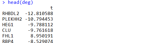 ..$ gene : chr [1:11093] "NOC2L" "PLEKHN1" "PERM1" "ISG15" ... ..$ PANC1.WT.Rep1 : num [1:11093] 10.05 7.54 6.28 10.94 6.96 ... ..$ PANC1.WT.Rep2 : num [1:11093] 11.95 8.13 6.42 11.47 7.2 ... ..$ PANC1.WT.Rep3 : num [1:11093] 12.06 8.71 6.59 11.43 7.52 ... ..$ PANC1.FOXA2KO.Rep1: num [1:11093] 12.31 8.05 6.29 11.55 7.06 ... ..$ PANC1.FOXA2KO.Rep2: num [1:11093] 12.14 8.29 6.49 11.37 7.49 ... ..$ PANC1.FOXA2KO.Rep3: num [1:11093] 11.49 8.62 6.78 11.18 7.07 ... ..- attr(*, "spec" )= .. .. cols( .. .. gene = col_character(), .. .. PANC1.WT.Rep1 = col_double(), .. .. PANC1.WT.Rep2 = col_double(), .. .. PANC1.WT.Rep3 = col_double(), .. .. PANC1.FOXA2KO.Rep1 = col_double(), .. .. PANC1.FOXA2KO.Rep2 = col_double(), .. .. PANC1.FOXA2KO.Rep3 = col_double() .. .. ) $ design : spc_tbl_ [6 × 2] (S3: spec_tbl_df/tbl_df/tbl/data.frame) ..$ sample : chr [1:6] "PANC1.WT.Rep1" "PANC1.WT.Rep2" "PANC1.WT.Rep3" "PANC1.FOXA2KO.Rep1" ... ..$ condition: chr [1:6] "PANC1.WT" "PANC1.WT" "PANC1.WT" "PANC1.FOXA2KO" ... ..- attr(*, "spec" )= .. .. cols( .. .. sample = col_character(), .. .. condition = col_character() .. .. ) $ limma_ttop: spc_tbl_ [11,093 × 7] (S3: spec_tbl_df/tbl_df/tbl/data.frame) ..$ ID : chr [1:11093] "RHBDL2" "PLEKHH2" "HEG1" "CLU" ... ..$ logFC : num [1:11093] -1.82 -1.57 -1.73 -1.79 2.09 ... ..$ AveExpr : num [1:11093] 8.6 7.7 8.64 12.22 9.61 ... ..$ t : num [1:11093] -12.81 -10.79 -9.79 -9.76 8.95 ... ..$ P.Value : num [1:11093] 0.00000303 0.00000993 0.0000194 0.00001976 0.00003552 ... ..$ adj.P.Val: num [1:11093] 0.0336 0.0548 0.0548 0.0548 0.0788 ... ..$ B : num [1:11093] 3.95 3.27 2.84 2.83 2.43 ... ..- attr(*, "spec" )= .. .. cols( .. .. ID = col_character(), .. .. logFC = col_double(), .. .. AveExpr = col_double(), .. .. t = col_double(), .. .. P.Value = col_double(), .. .. adj.P.Val = col_double(), .. .. B = col_double() .. .. )提取count: