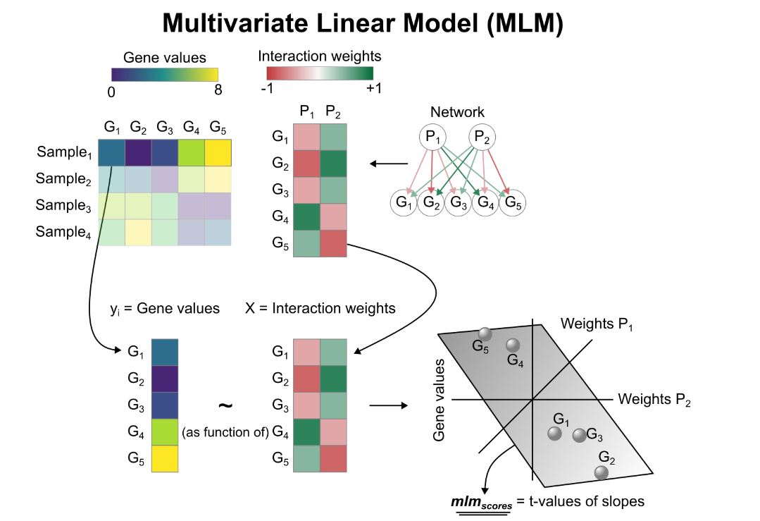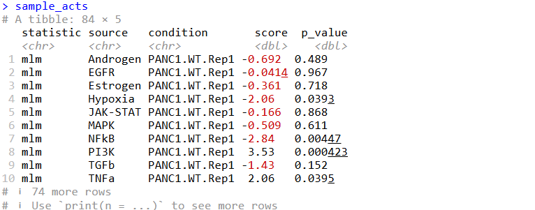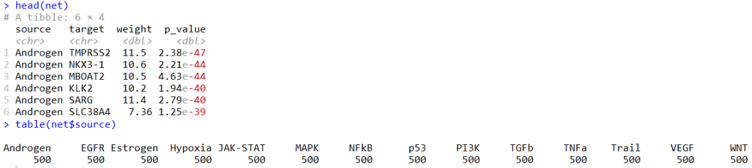 # 这里需要安装一下OmnipathR包 # BiocManager::install("OmnipathR") net 'human', top = 500) net head(net) table(net$source )# 保存一下,这里不是很好下载,后面看看是不是有什么地方可以加速这个下载 saveRDS(net,file = "net.rds" ) 3、使用decoupleR评估PROGENy基因集在此数据中的活性 活性推断采用的模型为:Multivariate Linear Model (MLM),MLM在文章中方法的可靠性排前三 。推断的打分如果为positive,表示 the pathway is active;如果是negative,则inactive。