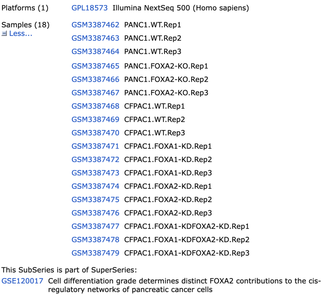 GSM3387462 PANC1.WT.Rep1 GSM3387463 PANC1.WT.Rep2 GSM3387464 PANC1.WT.Rep3 GSM3387465 PANC1.FOXA2-KO.Rep1 GSM3387466 PANC1.FOXA2-KO.Rep2 GSM3387467 PANC1.FOXA2-KO.Rep3 GSM3387468 CFPAC1.WT.Rep1 GSM3387469 CFPAC1.WT.Rep2 GSM3387470 CFPAC1.WT.Rep3 GSM3387474 CFPAC1.FOXA2-KD.Rep1 GSM3387475 CFPAC1.FOXA2-KD.Rep2 GSM3387476 CFPAC1.FOXA2-KD.Rep3找到了GSE119931_raw_counts_GRCh38.p13_NCBI.tsv.gz,这个2022-12-15的749.7 Kb的文件,然后进行两次差异分析,然后做交集看看,韦恩图或者更多丰富的方法, 也可以去看看文献:FOXA2 controls the cis-regulatory networks of pancreatic cancer cells in a differentiation grade-specific manner. EMBO J 2019 Oct 做更丰富的生物学解读!