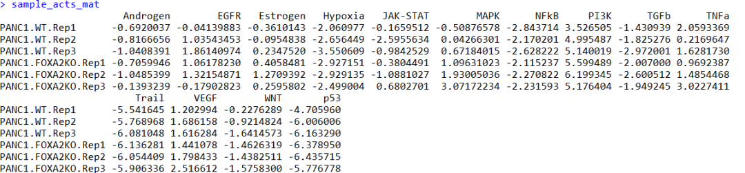 # Transform to wide matrix sample_acts_mat % tidyr::pivot_wider(id_cols = 'condition' , names_from = 'source' , values_from = 'score' ) %>% tibble::column_to_rownames('condition' ) %>% as.matrix() sample_acts_mat# Scale per feature sample_acts_mat 打分矩阵: