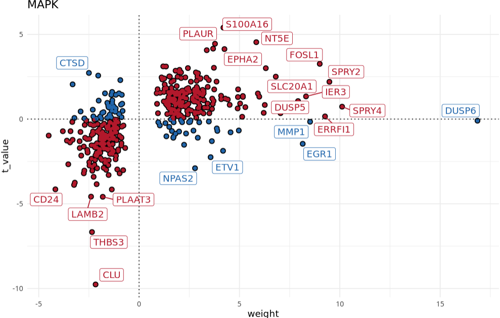我们可以进一步沿着它们的t值可视化每个通路中最有反应的基因,以解释结果。例如,让我们来看看属于MAPK通路的基因: