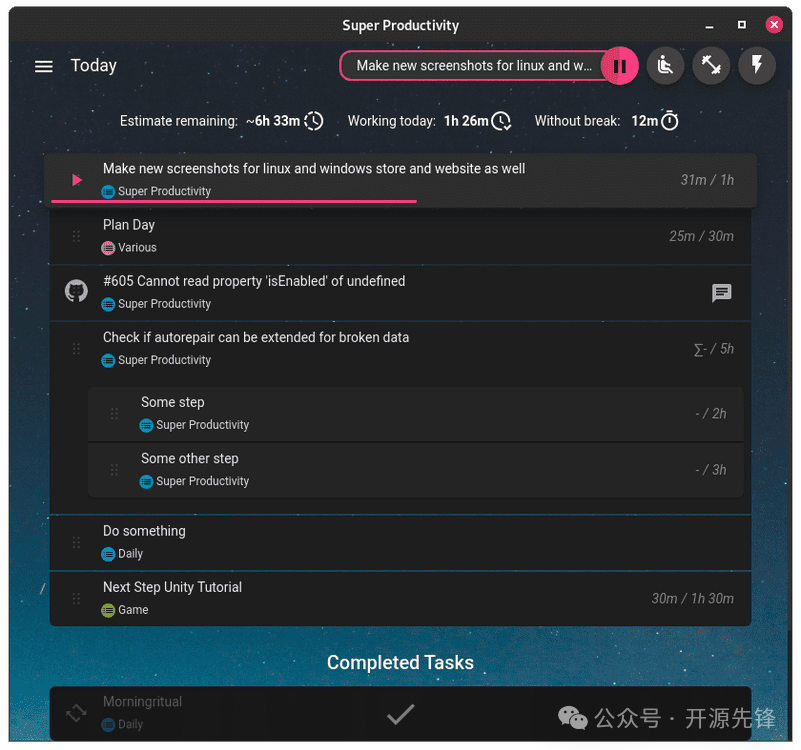 今天开源君分享一款超赞的开源项目 - Super Productivity,这款工具简直就是工作狂们的福音,尤其适合那些需要与 JIRA 或 Git 集成的开发者或团队。