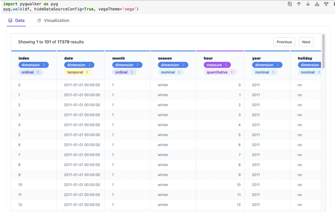 这一行代码允许你以表格格式处理数据,而 import pygwalker as pyg