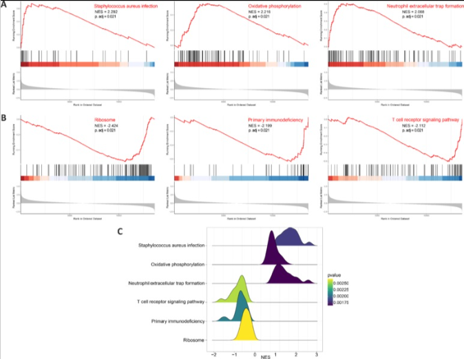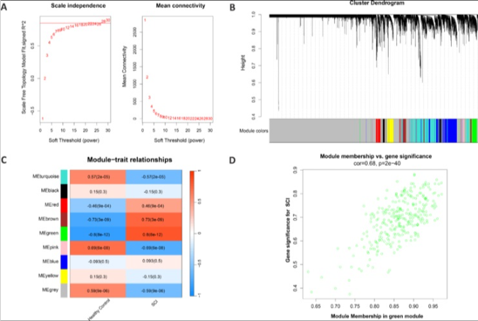 图3的基因集富集分析(GSEA)结果强调了SCI患者中显著活跃的信号通路,图3A显示了与金黄色葡萄球菌感染、氧化磷酸化等相关的活跃基因集,图3B则指出了T细胞受体信号通路等的抑制情况。接着,图4通过加权基因共表达网络分析(WGCNA)识别了与SCI相关的关键基因模块,显示了与临床特征的显著相关性(图4C和4D),为后续生物标志物的筛选提供了重要线索。