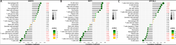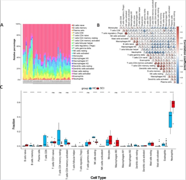 在临床样本中的验证结果(图7)进一步显示ANO10和BST1的显著升高,以及ZFP36L2的降低,强调了这些生物标志物在SCI中的重要性。最后,图8的免疫细胞成分估计揭示了SCI对免疫细胞亚群比例的显著影响,并且图9的相关性分析显示了这些生物标志物与免疫细胞亚群之间的显著相关性,提示了它们在调节免疫功能方面的重要作用。这些发现将为未来的研究提供理论基础,尤其是在SCI的早期诊断和治疗策略方面。