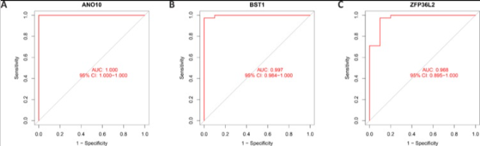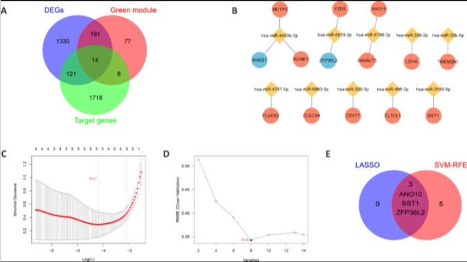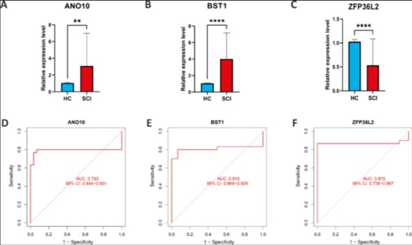 图5展示了通过miRanda和RNAhybrid构建的miRNA-mRNA靶向调控网络,14个重叠基因的韦恩图(图5A)显示了这些基因的潜在靶基因,构建的miRNA-mRNA网络提供了重要的调控机制见解。图6的ROC曲线分析结果验证了ANO10、BST1和ZFP36L2作为SCI生物标志物的有效性,提示这些基因在临床诊断中的潜在应用价值。