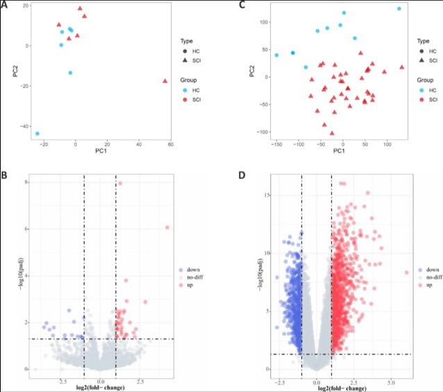 在脊髓损伤(SCI)的研究中,图1通过主成分分析(PCA)和差异表达分析,揭示了SCI患者与健康对照组(HCs)在miRNA和mRNA表达谱方面的显著差异。图1A的PCA图显示出两组在miRNA表达上的明显分隔,图1B的火山图则指出了54种差异表达的miRNA,其中39种上调,15种下调。针对mRNA表达谱,图1C的PCA图同样显示了38个SCI患者与10个HC之间的明显分隔,而图1D的火山图进一步阐明了1656个差异表达基因(DEGs)的变化情况,908个上调,748个下调。这些分析为后续的生物信息学研究奠定了基础,提示了可能涉及的特定分子通路和机制。