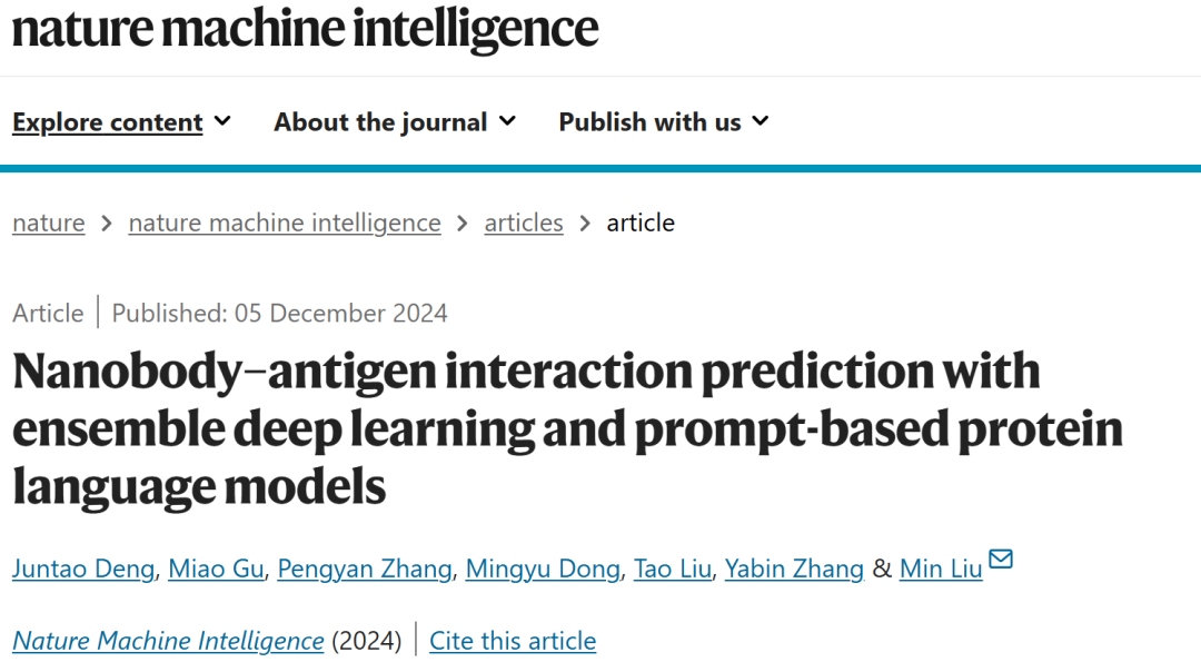 Deng, J., Gu, M., Zhang, P. et al. Nanobody–antigen interaction prediction with ensemble deep learning and prompt-based protein language models. Nat Mach Intell (2024).