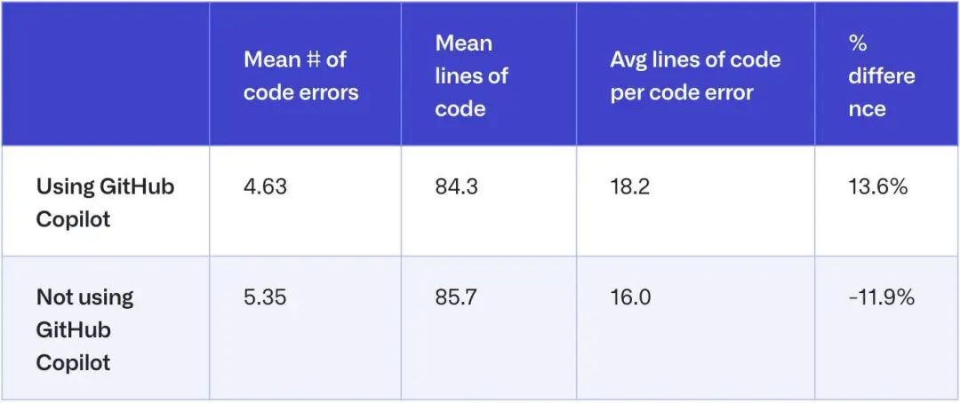 使用 GitHub Copilot 时,每发生一个错误所间隔的代码行数平均增长 13.6%(p=0.002);