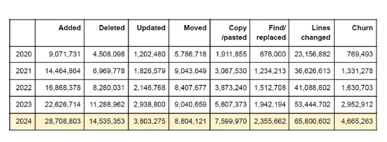 根据 GitClear 的一项最新研究,代码质量有下降趋势,且存在代码更新(即添加代码后不久即被删除)等问题,重复代码的比例也更高。此项研究重点关注对于代码的添加、删除、更新以及复制 / 粘贴或移动,并排除了 GItClear 定义的“噪音”内容——即在多个分支中重新提交的相同代码、空白行及其他不重要的行。以下是 GitClear 分析师们得出的结论: