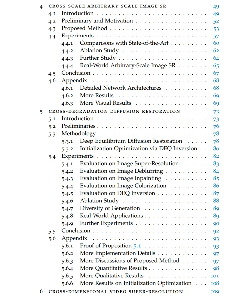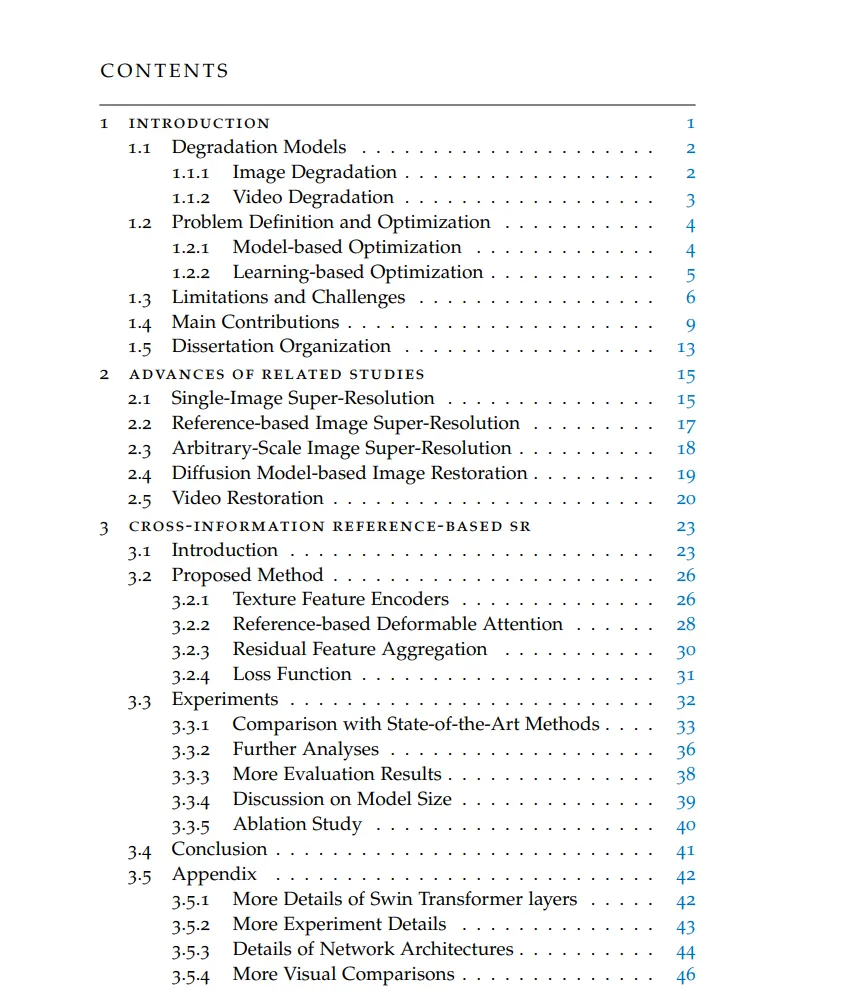 综上所述,本论文在图像和视频SR领域做出了贡献,在多个基准数据集上达到了最先进的性能。我们相信所提出的SR方法在娱乐(如老电影或照片修复)、智能手机、数码相机、医学成像、视频会议和视频游戏等领域具有广泛的应用潜力。