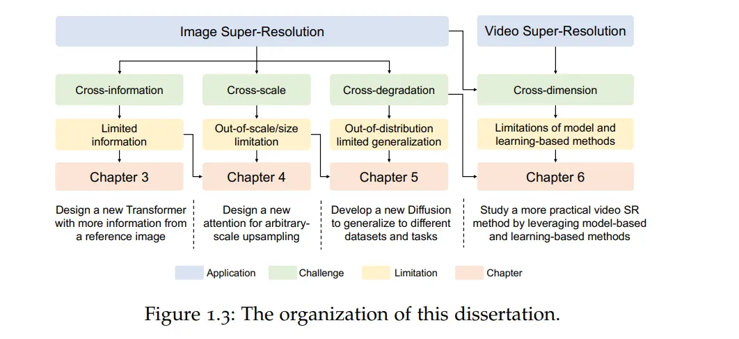 **超分辨率(Super-Resolution, SR)旨在从低分辨率(LR)图像或视频中恢复高分辨率(HR)图像或视频。**近年来,深度学习的崛起极大地推动了SR技术的发展,通过深度神经网络实现了令人印象深刻的实际应用。尽管取得了巨大进展,SR仍面临诸多关键挑战,包括整合跨信息、有效扩展跨尺度图像分辨率、同时处理跨退化问题,以及向跨维度任务扩展。这些挑战在实际应用中表现为信息不足导致恢复效果受限、难以推广到非尺度图像、处理多种退化问题的困难,以及视频SR在现实场景中的应用局限。为了解决这些问题,本论文提出了以下SR方法。1. 解决跨信息挑战:DATSR 方法