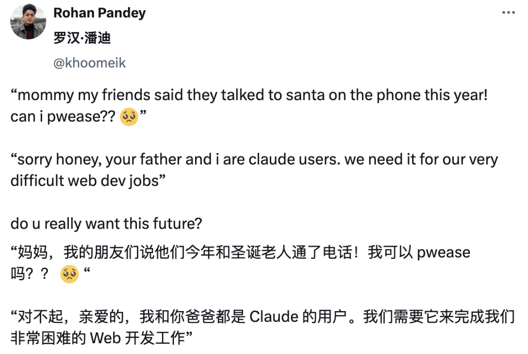 在直播活动过程中,主持人也向这位「圣诞老人」询问几个问题,包括但不限于最喜欢的圣诞传统、最喜欢的驯鹿等等。有趣的是,当 Kevin Weil 戴上圣诞老人的假胡子询问如何保养时,给出建议的 ChatGPT 还会用圣诞老人的口吻回应道:这款语音将在今天推出,而为了让每个用户都能体验到这个节日彩蛋,首次体验时,用户的高级语音使用次数将会得到重置。而即便用完额度,用户也能继续通过标准语音模式与「圣诞老人」互动。或许是因为发布会战线拉得太长,网友的吐槽声也聚焦到了这款圣诞老人语音上。Google Deepmind 研究科学家 Jonas Adler 更是直接呛声 OpenAI:OpenAI 总能迅速对我们发布的产品做出回应,而且似乎总能在同一时间发布,这令人感到神奇。