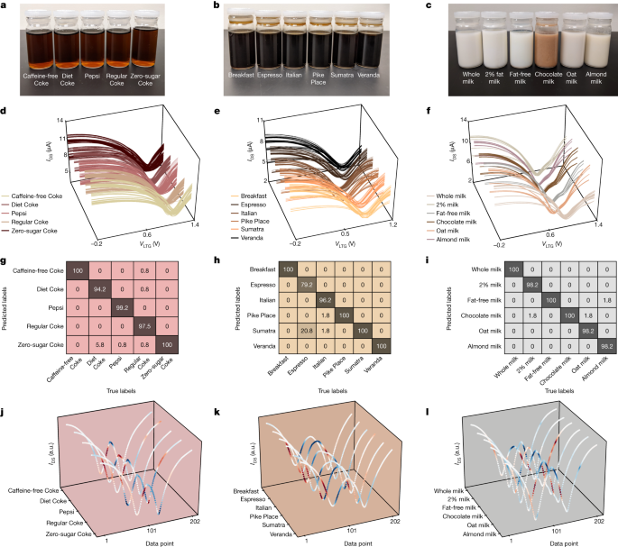 针对果汁和酒类样品中的复杂成分,通过多种微观机理表征方法,作者深入研究了ISFET响应与样品成分之间的关系。具体而言,针对果汁分类任务,作者使用k-NN和ANN(人工神经网络)模型对样品进行分类,结果表明,不同水果的ISFET测量数据可以有效区分,且分类精度达到了令人满意的水平。此外,通过SHAP分析,作者深入理解了各个特征对于分类决策的贡献,从而挖掘出特定成分对样品特征的影响。