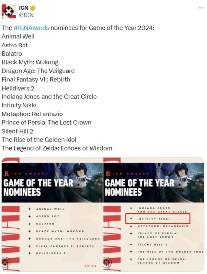值得关注的是,自IGN开设这一奖项以来,《黑神话:悟空》和《无限暖暖》是唯二获得这一重量级提名的非手机端国产游戏。(36氪)