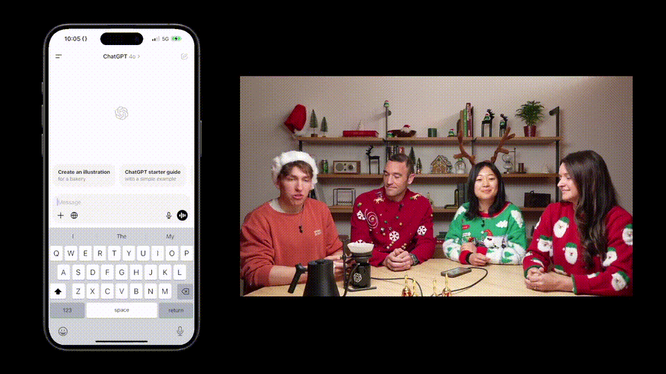 新功能就像一场单向视频通话,用户不仅能听到ChatGPT的声音,还能实时分享屏幕,让它分析并提供反馈。要使用这项功能,用户只需在ChatGPT应用中点击语音图标,切换到视频模式进行直播,或点击菜单中的“共享屏幕”选项,轻松分享屏幕内容。