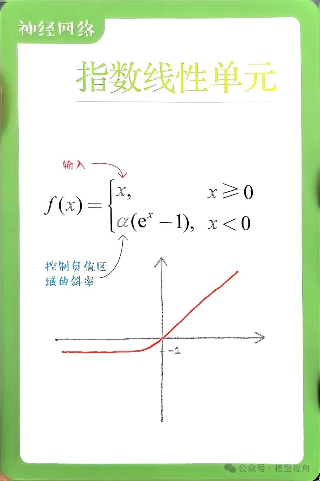 ELU(指数线性单元)通过在输入为负时使用指数函数改善了 ReLU 的性能,其定义为: