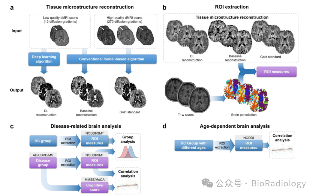 图1 概述了拟议的工作,其中使用具有12个扩散梯度的临床质量dMRI扫描进行疾病相关和年龄依赖性脑组织变化的分析:(a)使用DL和常规重建计算组织微观结构,以及计算金标准组织微观结构;(b)提取用于脑组织分析的roi;(c)分析与疾病有关的脑组织变化的工作流程;(d)年龄依赖性脑组织变化分析的工作流程。