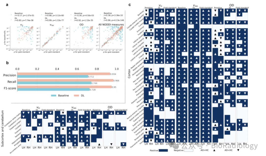 图2 基于ROI的AD NODDI组织微观结构变化分析:(a) DL/基线方法与金标准原始p值的对数尺度散点图。还指出了DL/基线方法的原始p值与金标准原始p值之间的相关性。(b)检测显著不同区域的精度、灵敏度和f1评分。(c)探测区域。向上或向下三角形分别表示AD组的平均值高于或低于HC组的平均值,仅表示两组在金标准结果中的roi和组织微观结构测量值存在显著差异(经多次比较benjamin - hochberg校正p < 0.05)。LH =左半球,RH =右半球,DL =深度学习,ROI =感兴趣区域,HC =健康对照组,AD =阿尔茨海默病,NODDI =神经突定向弥散和密度成像,vic =细胞内体积分数,viso =脑脊液体积分数,OD =定向弥散。