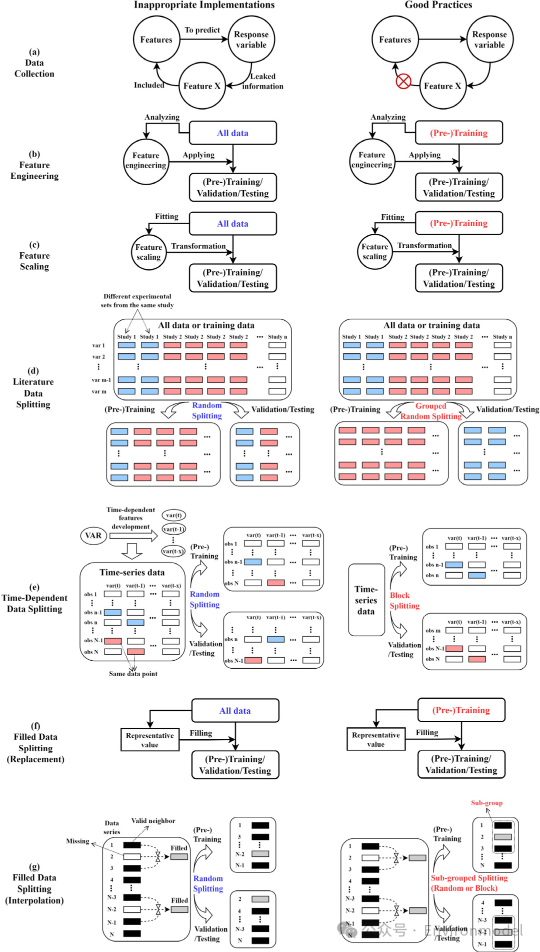 图 3. 不涉及交叉验证时监督学习模型开发中常见且容易被忽视的数据泄露问题,以及解决此类问题的相应良好实践。不恰当的实现和良好实践之间的主要区别(文本)分别标记为蓝色和红色。大多数问题都是由于错误地利用所有数据来生成必要的信息而导致的。
