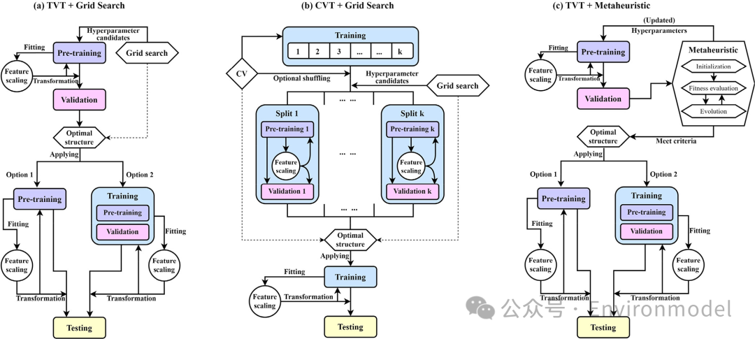 机器学习具有内置的学习能力,这是其内在的优化过程(如随机梯度下降SGD),而外部的超参数优化(HPO)过程有时会被忽视。无论研究目的如何,HPO都是一个有益的步骤,因为它有助于构建更准确、更稳健、更可靠的模型。图 6显示了三个典型的简化 HPO 图。考虑到通常可用的资源有限,建议使用 GS 或类似的搜索算法,并且可以与 TVT 和 CVT 一起调整。元启发式方法需要更多的计算资源,因此 TVT 可能是一种更具成本效益的实践框架。GS 需要研究人员预先定义n 个超参数组合候选,该函数通过基于 TVT 设计中的候选重复n次预训练到验证步骤来工作(图 6)。本文中,作者使用TVT(预训练、验证和测试)和CVT(使用交叉验证 (CV) 进行训练和测试)来表示另外两个最常见的数据拆分框架。