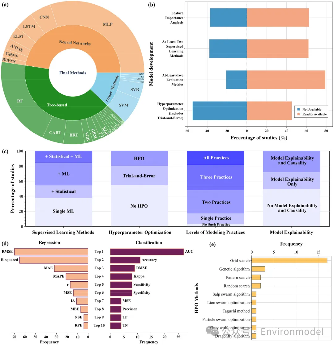 图 5. 基于 148 篇高引用率研究对模型开发、优化和解释中的主要问题进行定量评估。(a)研究中使用的最终方法的分数。(b)进行每种建模实践的研究的百分比。(c)采用 ML/统计方法、进行 HPO、具有不同级别的建模实践并执行模型可解释性和因果关系的研究的百分比。(d)用于回归和分类问题的前十大评估指标。(e)最常见的 HPO 方法。模型优化——提升信心和活力