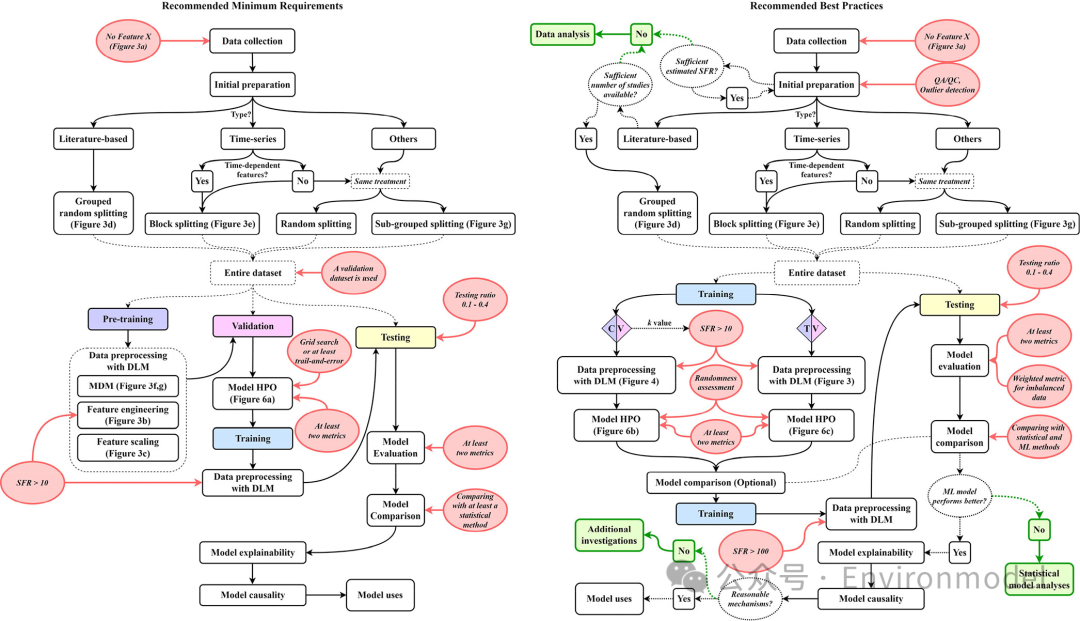 图 7. 环境研究中监督机器学习模型开发的 (a) 最低要求和 (b) 最佳实践的建议。请注意,它们仅代表典型条件,应根据具体情况应用配置。要求以红色圆圈表示,三个备选终点以绿色突出显示。训练、预训练、验证和测试子集也以颜色突出显示。Soil & Environmental Health是由朱利中院士、朱永官院士和马奇英教授担任主编、浙江大学与Elsevier合作出版的全英文开放获取国际学术期刊。自2022年12月以来,期刊出版了来自16个国家的61篇优秀文章;期刊CiteScoreTracker 2024 为5.5,目前已被DOAJ、Scopus和CAS数据库收录。