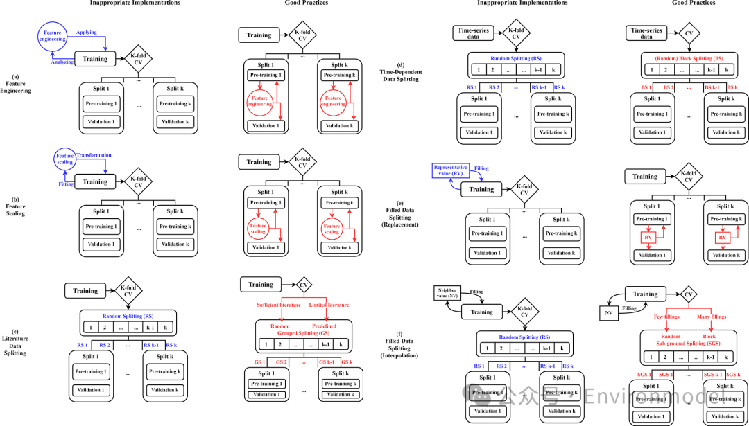 图 4. 监督学习模型开发中涉及交叉验证时常见且容易被忽视的数据泄露问题,以及解决此类问题的相应良好做法。不适当实现和良好做法之间的主要区别(文本)分别标记为蓝色和红色。许多问题都是由于错误地未在 CV 循环中包含数据预处理步骤而导致的。