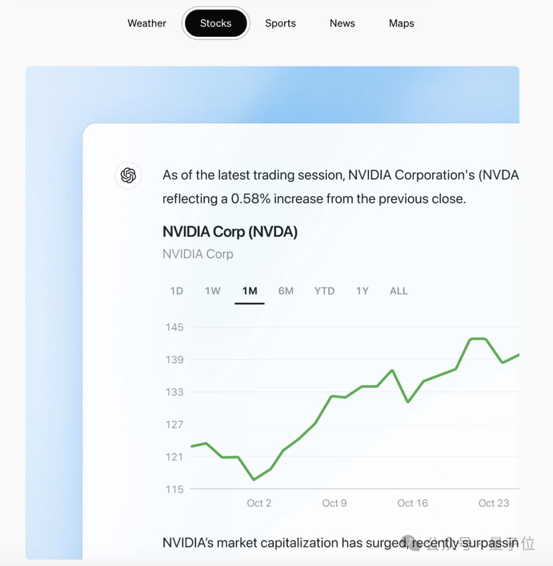 根据一个多月来的用户反馈,OpenAI也与新闻和数据提供商合作,在搜索功能中,为天气、股市、体育、新闻和地图等添加了最新信息和新的视觉设计——多模态结果。