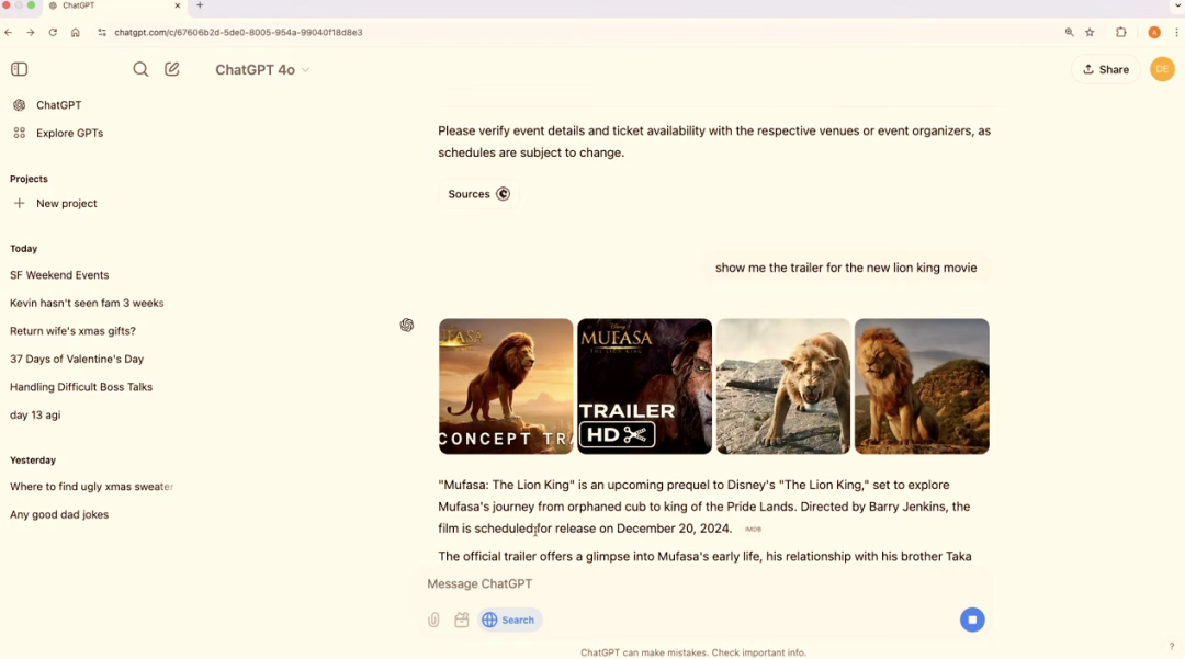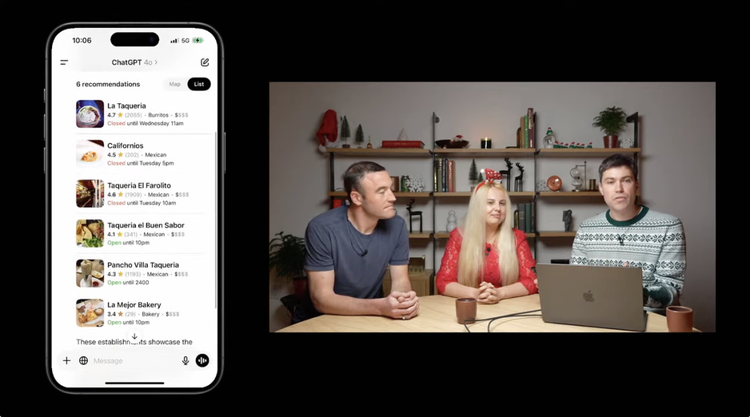 上个月,OpenAI 宣布推出 ChatGPT Search。但当时这位入局搜索引擎的新选手还谈不上颠覆 Google 搜索,而今天向全球用户免费开放的新版 ChatGPT Search 则旨在补齐获取实时多模态信息的短板。高级语音模式现已支持实时网页搜索,并支持多语言实时翻译ChatGPT 能够智能判断是否需要执行网页搜索,用户也可通过点击 🌐 图标手动触发搜索搜索结果中的视频可直接在 ChatGPT 聊天窗口中播放支持将 ChatGPT Search 设为默认浏览器,提升网页导航效率移动端搜索结果优化显示,包含完整商业信息描述和丰富视觉内容本次发布会由 OpenAI 首席产品官 Kevin Weil、ChatGPT 搜索产品负责人 Adam Fry 以及技术人员 Cristina Scheau 共同主持。在接连多天发布会后,不仅蹲守直播的用户感到疲软,就连 Kevin Weil 也显得有些敷衍,照着提词器念台词的痕迹就差没明着来。言归正传,升级后的 ChatGPT Search 功能变得更「聪明」了。比如说,当你询问「这个周末在旧金山有哪些好玩的活动」时,ChatGPT 会自动判断是否需要获取最新网络信息,亦或者你主动点击「搜索网络」的图标,ChatGPT 将始终从网络获取最新的信息来回答问题。ChatGPT 反馈的的答案包含丰富的图片和列表,一眼望去,倒是比 Google 搜索引擎更清爽。搜索结果会标注信息来源,有效降低 AI 幻觉的危害,你可以直接跳转到相关网站,查看详细的视觉内容和其他搜索结果。ChatGPT Search 最大的特色在于其对话式交互方式。比如在讨论旧金山雨天活动选择时,想去看场电影,我们可以先在 ChatGPT 搜索并播放新版《狮子王》的预告片,降低踩雷的风险。对于习惯使用 ChatGPT 作为默认搜索引擎的用户来说,现在则可以更快速地访问各类网站,如 Netflix。甚至还能在浏览器地址栏直接搜索酒店预订网站。ChatGPT 会优先展示目标网站链接,并在侧边栏提供相关链接供参考。在移动端,ChatGPT Search 升级后的表现同样出色。以搜索最好的墨西哥餐厅为例,ChatGPT 会提供包含视觉信息、营业时间等完整商户信息的列表。我们可以通过自然对话进一步筛选,如查找「有户外露台和加热器的餐厅」,无需修改关键词或重新搜索。嫁入苹果大户人家的 ChatGPT,也享受到了与苹果地图完美集成的本地化体验,点击地图按钮,就能直接查看这些商户,并使用本地的苹果地图进行实地浏览。关注 AI 第一新媒体,率先获取 AI 前沿资讯和洞察