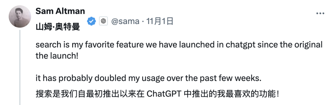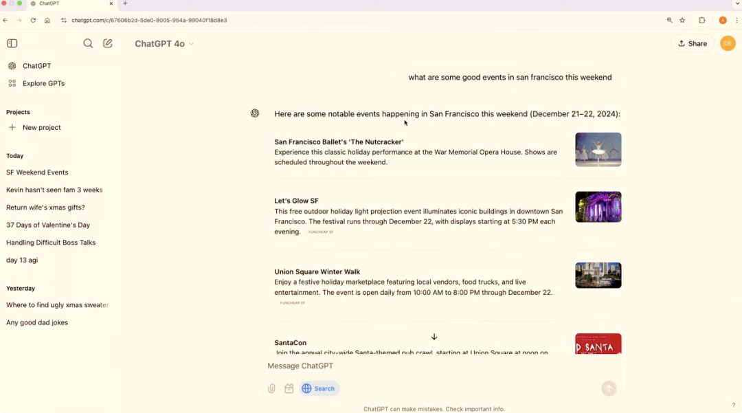 比如说,你打算去瑞士度假,它能用流畅的语气告诉你苏黎世在某一周有什么活动。具体的节庆活动,到访的圣诞马戏团,音乐秀等都能娓娓道来。时间如果更具体一些,包括圣诞市场的开门日期和时间,苏黎世今天的天气,甚至纽约联合广场的开放时间,ChatGPT 都能一一作答。遗憾的是,这次发布会的结尾没有笑话,演示人员要求 ChatGPT 展示用德语、法语和意大利语说「圣诞快乐」,支持 50 多种语言的它自然轻松拿捏。最后,木有感情的 Kevin Weil 也「剧透」了明天直播活动的详情,那就是将举行一个「迷你」开发者日,发布更多「激动人心」的消息。还记得上个月 ChatGPT Search 刚发布时,OpenAI CEO Sam Altman 在 X 平台发文称:搜索是我们自 ChatGPT 推出以来,我最喜欢的功能!