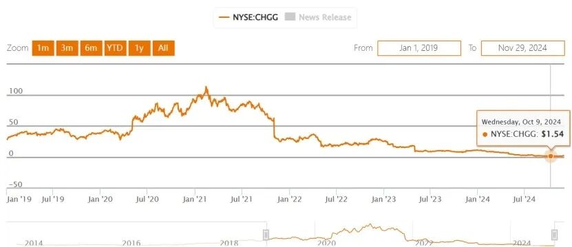 Chegg 历年订阅服务用户数 | 数据来源 Chegg 财报2022 年,Chegg 达到了自己的数据巅峰,突破 820 万的订阅用户量,当时的营收也达到 7.6 亿美元。但到了 2024 年 Q3 订阅用户数近乎腰斩,不足 400 万。公共投资人对于这样的业务数据也是用脚投票,Chegg 最风光时,股价达到 113 美元,市值约 147 亿美元。而如今 Chegg 股价仅剩 2.19 美元,市值约 2.28 亿美元。股价下跌 98%,市值蒸发 98%。