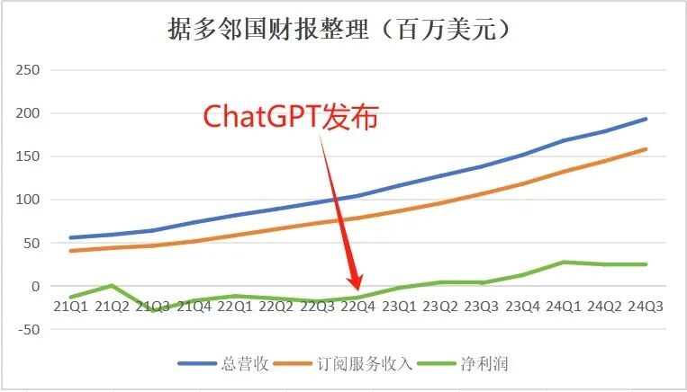 然而,同为教育类上市公司的多邻国(NASDAQ:DUOL)却递交了完全不同的成绩单。多邻国第三季度财报显示,营收 1.93 亿美元,同比增长 40%;订阅服务收入 1.58 亿美元,同比增长 49%;净利润 2340 万美元,同比增长 7 倍多。
