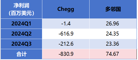 多邻国成立于 2011 年,凭借“广告+订阅”的商业模式于 2021 年成功在纳斯达克上市。据多邻国官方数据显示,订阅收入一直占总营收的 70% 以上,今年 Q2 以来保持在 80% 以上。相似的商业模式,同样经历了 ChatGPT 热潮,相比于 Chegg 2024 年前三季度累计净亏损 8 亿美元,多邻国财报显示同期净利润为 7467 万美元,同比增长 1790.3%(多邻国没有公布 non-GAAP 净利润数据,此处用净利润进行比对)。