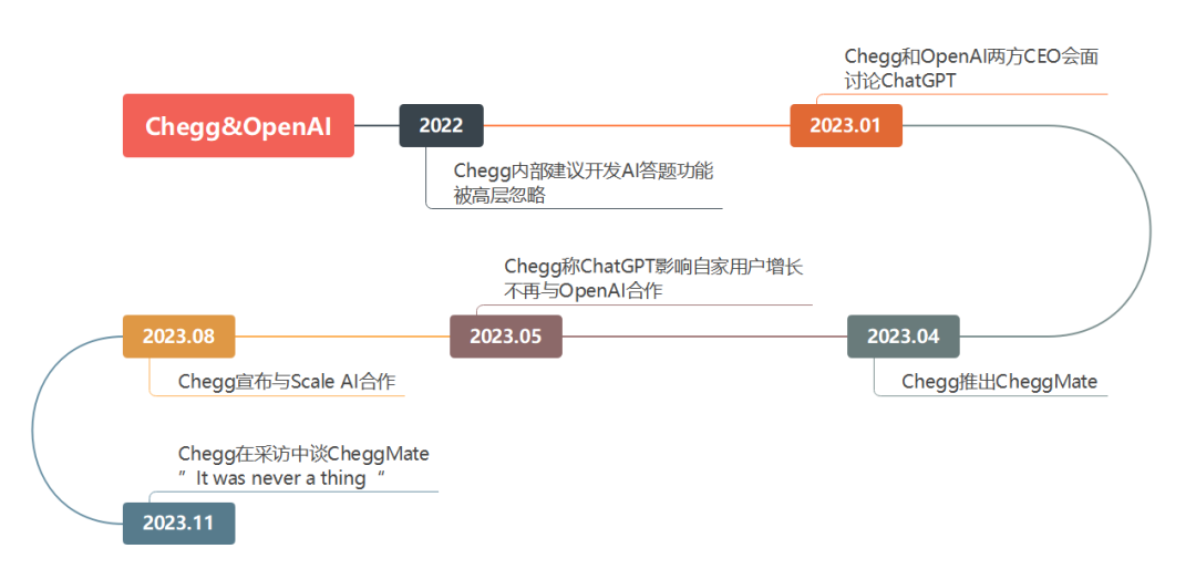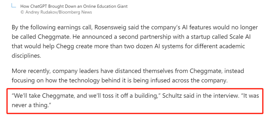 2023 年 8 月,Chegg 正式公告转向与数据标注公司 Scale AI 合作,计划为不同的学科构建 20 多个 AI 系统。此后,CheggMate 几乎不再被提及,官网和 Chegg Study 上也很难再找到其身影。同年 11 月的采访中,Dan 表达了对 CheggMate 的“厌恶”,看起来像对 OpenAI 的幼稚抱怨。