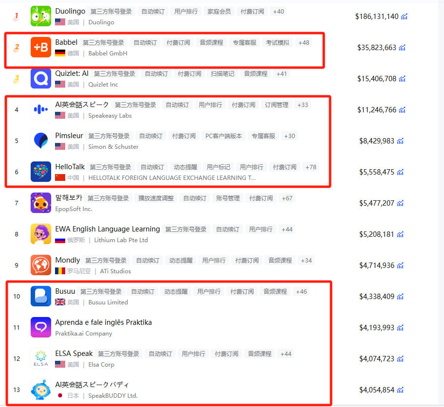 Gauth 2021 年 3 月上线,Question.AI 2023 年 5 月上线,Chatboard(后更名 Answer.AI)2023 年 3 月上线,产品近一年下载量均高于 Chegg Study | 图源点点数据如上所述,大模型可以答对一道题,但很难对系统性掌握一门语言这件事情造成过于大的冲击。因而可以看到 ChatGPT 大火之后,尤其是语音模态也发展相对成熟后,这些大模型带来的功能导致语言赛道上,新产品并不是 AI 学习语言,而是 AI 口语, Duolingo 因此受到冲击较小。