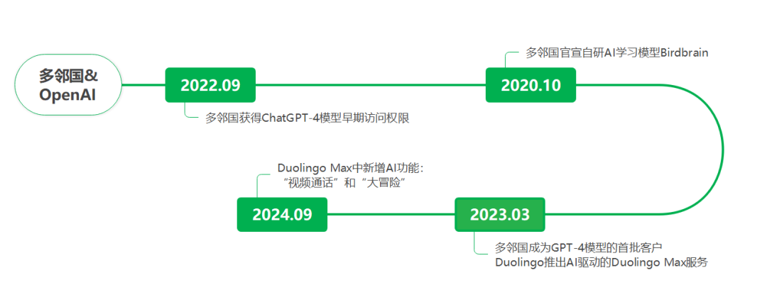 虽然没有官方公告,但从能找到的最早信息来看,早在 2022 年 9 月,Duolingo 就获得了 GPT-4 模型的早期访问权限(2023 年 3 月 ChatGPT-4 正式发布)。Duolingo 的 AI 负责人曾在采访中提到,在看到 GPT-4 的能力后,Duolingo 立即决定开发相关新功能,Duolingo Max 便由此而生。同年 10 月,多邻国发布官方公告推出自研学习模型 Birdbrain,基于 Duolingo 用户数据来优化课程质量、调整难度,OpenAI 的模型负责让对话更加自然,Birdbrain 则负责打造更加个性化内容,多邻国 CEO 称二者本质上是互补的。