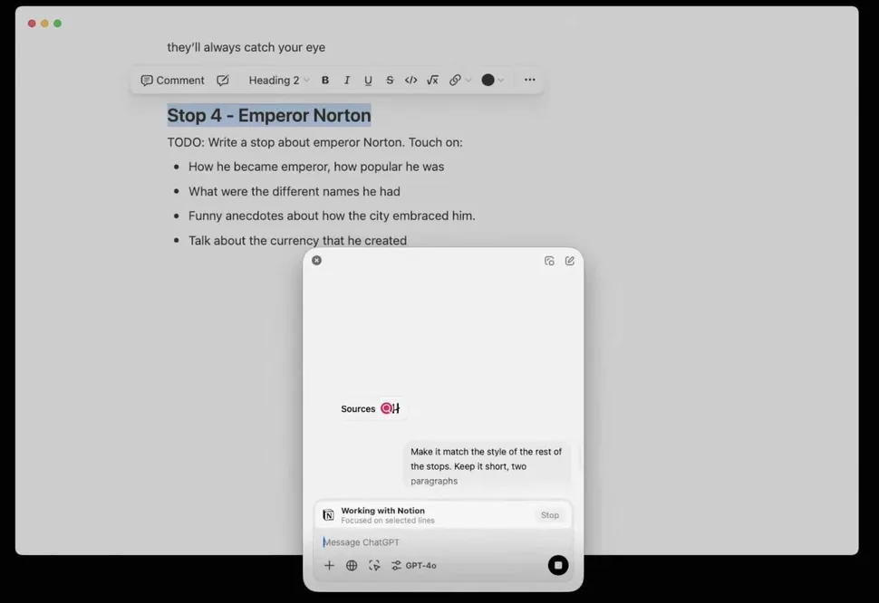 有了这个新功能,ChatGPT得以与Notion无缝协作。现场演示聚焦于文档中的特定文本段落,并设定任务为“补充这些对话要点”。此外,用户还可利用ChatGPT的搜索功能来生成回应。例如,在演示中,它根据所选文本生成了关于“诺顿皇帝(诺顿一世)”的对话要点,并附上引用及来源。