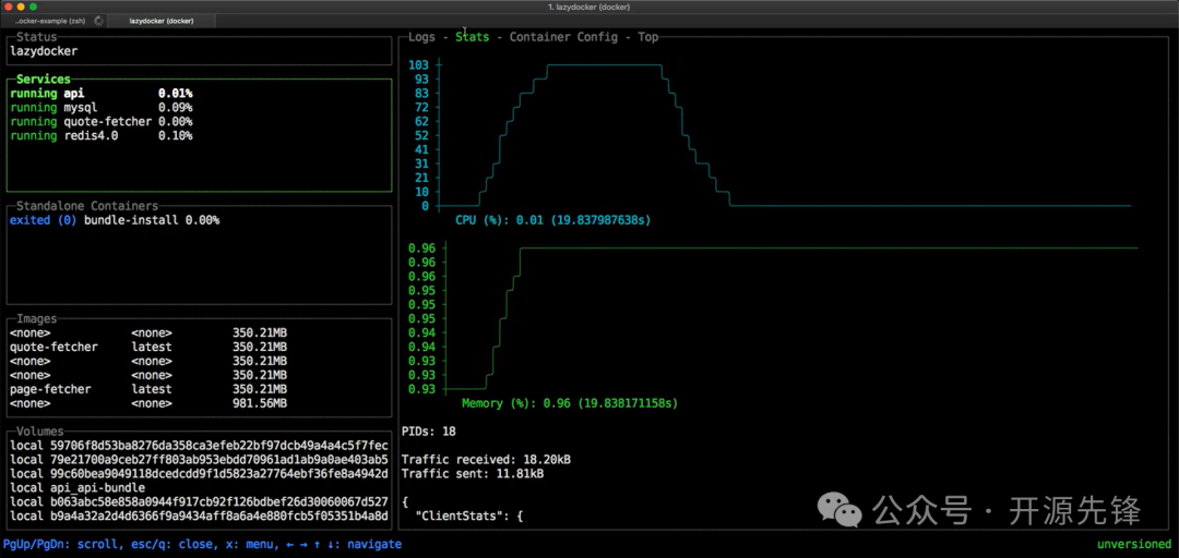 实时信息展示:Lazydocker 能够实时展示 Docker 容器和服务的状态。例如,你可以看到每个容器的运行状态、CPU 使用率、内存使用情况等信息,非常方便。