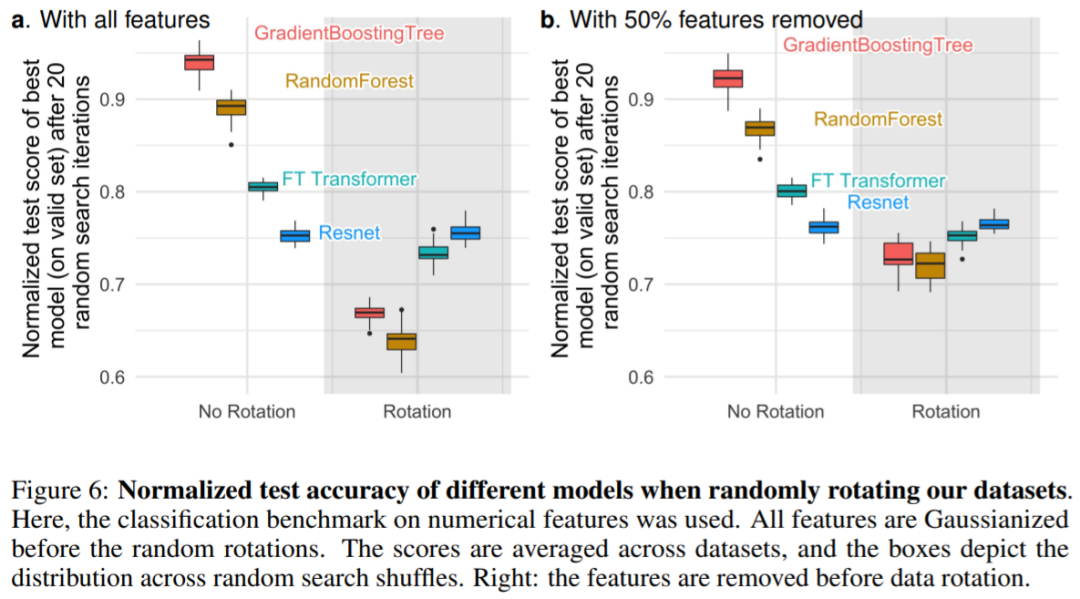 与其他模型相比,为什么 MLP 更容易受到无信息特征的影响?其中一个答案是,MLP 是旋转不变的:当对训练集和测试集特征应用旋转时,在训练集上学习 MLP 并在测试集上进行评估,这一过程是不变的。事实上,任何旋转不变的学习过程都具有最坏情况下的样本复杂度,该复杂度至少在不相关特征的数量上呈线性增长。直观地说,为了去除无用特征,旋转不变算法必须首先找到特征的原始方向,然后选择信息最少的特征。图 6a 显示了当对数据集进行随机旋转时的测试准确率变化,证实只有 Resnets 是旋转不变的。值得注意的是,随机旋转颠倒了性能顺序:结果是 NN 在基于树的模型之上,Resnets 在 FT Transformer 之上,这表明旋转不变性是不可取的。事实上,表格数据通常具有单独含义,例如年龄、体重等。图 6b 中显示:删除每个数据集中最不重要的一半特征(在旋转之前),会降低除 Resnets 之外的所有模型的性能,但与没有删除特征使用所有特征时相比,相比较而言,下降的幅度较小。原文链接:https://twitter.com/GaelVaroquaux/status/1549422403889