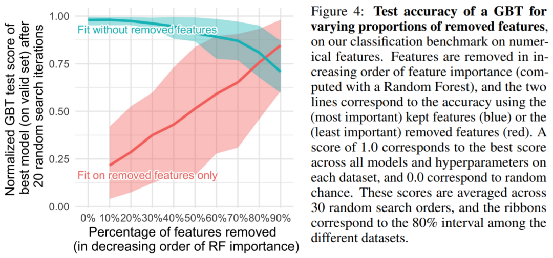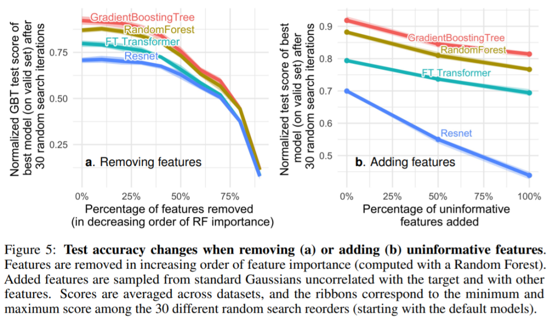 表格数据集包含许多非信息( uninformative)特征,对于每个数据集,该研究根据特征的重要性会选择丢弃一定比例的特征(通常按随机森林排序)。从图 4 可以看出,去除一半以上的特征对 GBT 的分类准确率影响不大。图 5 可以看到移除非信息特征 (5a) 减少了 MLP (Resnet) 与其他模型(FT Transformers 和基于树的模型)之间的性能差距 ,而添加非信息特征会扩大差距,这表明 MLP 对非信息特征的鲁棒性较差。在图 5a 中,当研究者移除更大比例的特征时,相应的也会删除有用信息特征。图 5b 表明,去除这些特征所带来的准确率下降可以通过去除非信息特征来补偿,与其他模型相比,这对 MLP 更有帮助(同时,该研究还删除了冗余特性,也不会影响模型性能)。